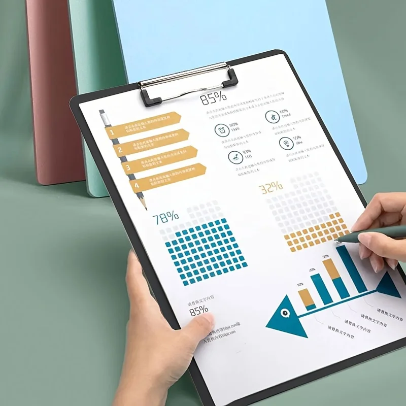1. Material:Plastic clipboards are made of thickened polypropylene (PP) plastic, not easy to bend and crack. The metal clips are made of high quality stainless steel, corrosion resistant, longer service life.